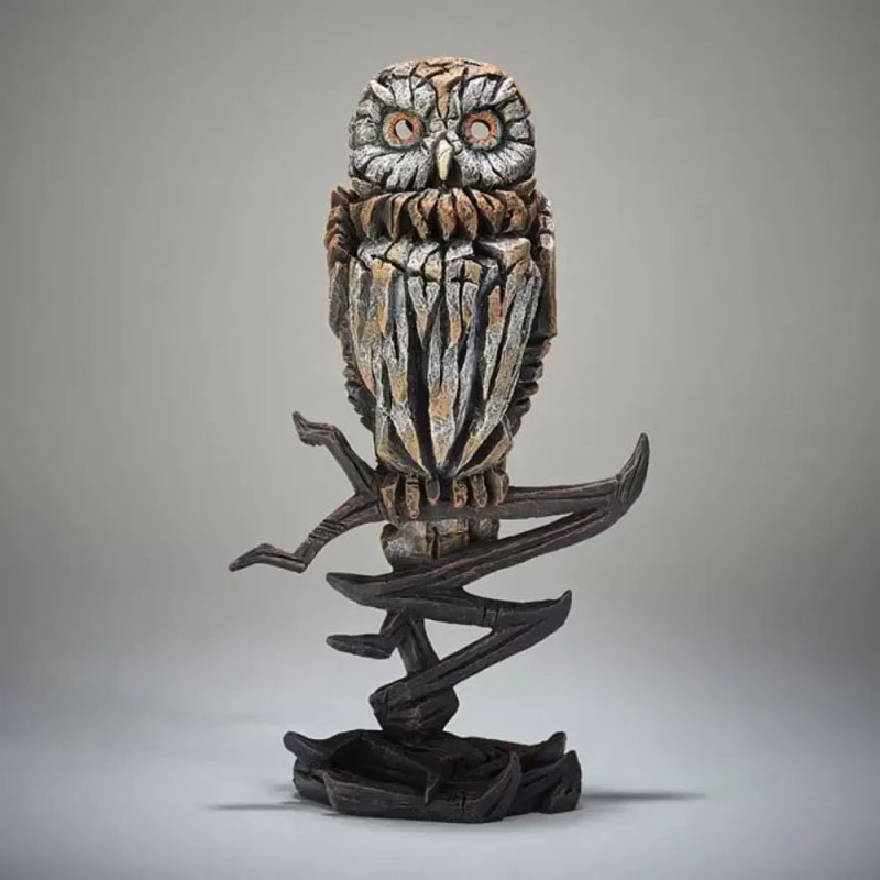 This contemporary animal sculpture, in the modern and graphic lines, represents a owl on a branch. It is an original work of the English workshop Edge.