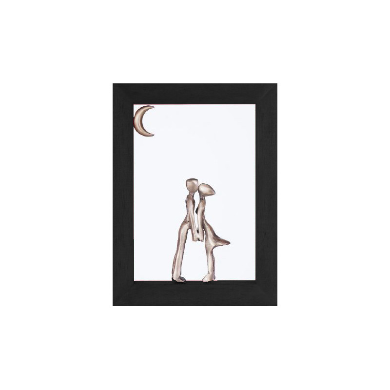 This bronze sculpture framed with black painted wood is a unique and original creation of the Greek artist Georges Roumanas. It represents a couple kissing under the moonlight.