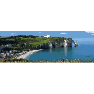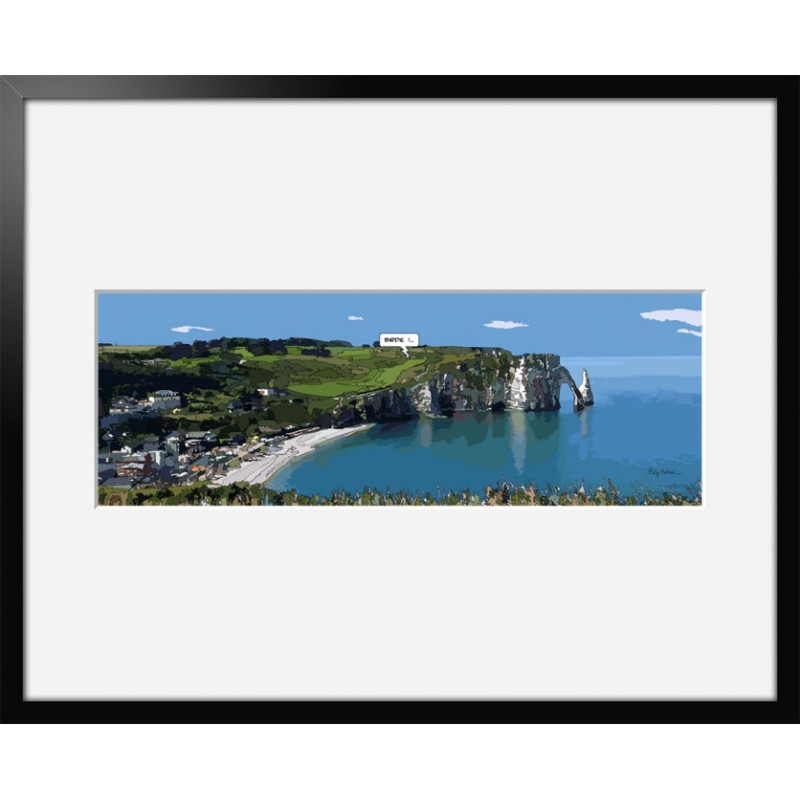 Philippe Matine offers a pretty atmospheres reworked in a comic book spirit. The famous view of the cliffs of Etretat (France) is depicted by the artist. A game of golf seems to take place in this exceptional setting.