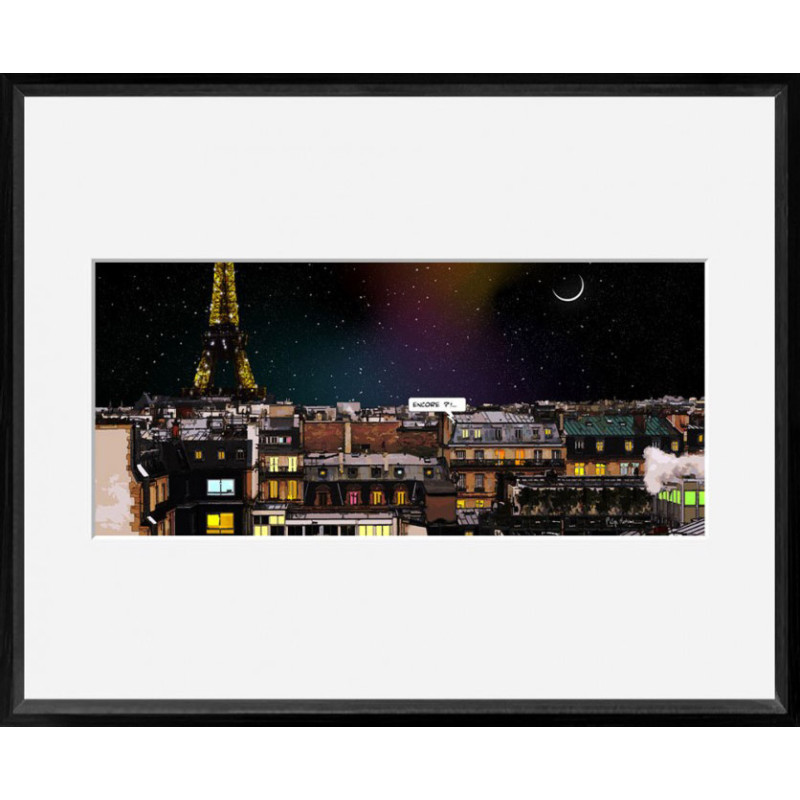 Philippe Matine offers a pretty atmospheres reworked in a comic book spirit. A starry sky enhanced by the pretty colors of a nebula, the golden lights of the Eiffel Tower, the Parisian rooftops... Everything is perfect in this Parisian setting!
