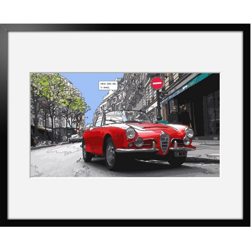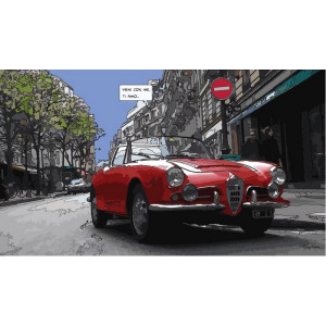 Philippe Matine offers a pretty atmosphere reworked in a comic book spirit. The 1962 Alfa-Romeo Giulietta Spider is a masterpiece of Italian automotive elegance designed, of course, by Pininfarina and which will appear in many Italian films of the 1960s, including the famous Dolce Vita.