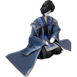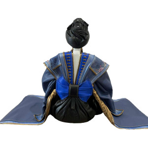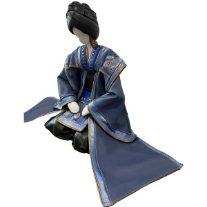 This piece of sculpture is made of leather. It is blue with some pink and golden details.